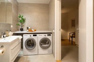 Lägenheten är modernt inredd med klinker i entrén, ek-laminatgolv i övriga rum, helkaklat badrum med tvättmaskin, torktumlare & handdukstork.
