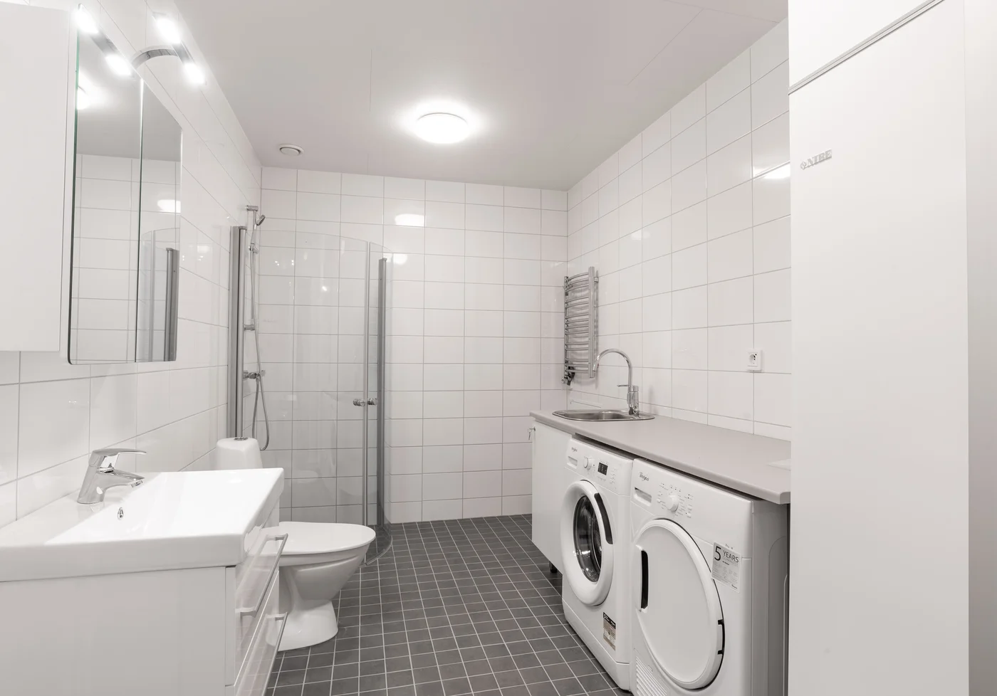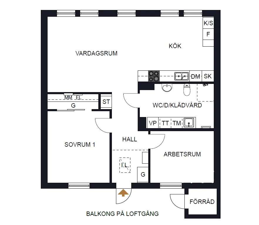 Bostaden har två sovrum, vardagsrum och kök samt badrum med dusch. Klinker i hall. Lägenheten håller genomgående hög standard med öppen planlösning mellan kök och vardagsrum. Rummen är ljusa med fina materialval. Köket är exklusivt inrett med bänkskiva i sten och badrummen är helkaklade med torktumlare och tvättmaskin. Samtliga lägenheter i loftplan har uteplats på framsidan som inbjuder till avkoppling och umgänge. Bra förvaring med garderober och invändigt förråd/ klädkammare.